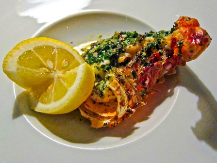 It's a cold wintery April evening as we make our way through a deserted city to Chéz Gerard. Surprisingly for an establishment that has a French feel, they use American names for the cuts, and we choose a trimmed Boston trimmed rib to share. I should say that we each tackle half a grilled rock lobster in herb butter, whilst we are waiting. Small, but perfectly formed, as they say, served in the shell with lashings of garlic.